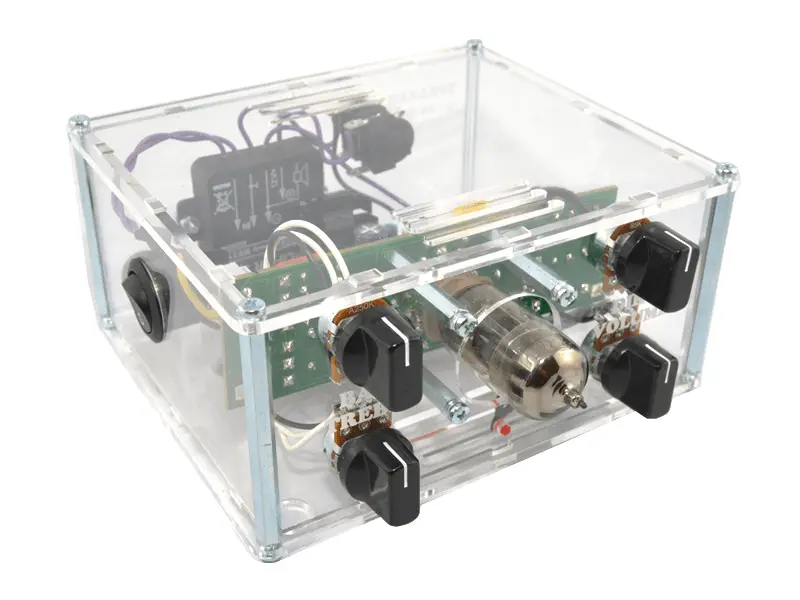Dieser Bausatz beinhaltet alle Bauteile die zum Bau des Tomato-Blaster benötigt werden wie Widerstände, Kondensatoren, Röhren, Schalter, Leitungen, Platine etc.
