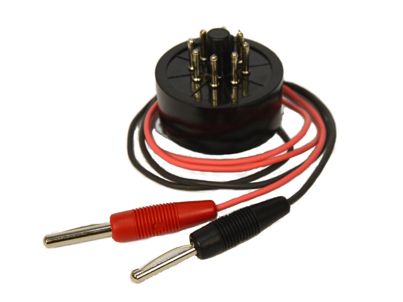 Messadapter für die indirekte Messung des Ruhestroms durch eine Röhre. Der Adapter wird zwischen Röhre und Sockel gesteckt und an ein handelsübliches Voltmeter (nicht im Lieferumfang enthalten) angeschlossen. Auf hohe Güte des Messgerätes sowie ausreichend geladene Batterien achten!