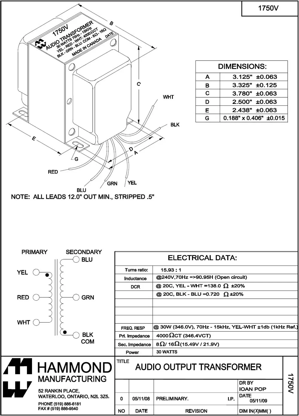Hammond 1750V VOX®-Stil Übertrager AC30 Vintage