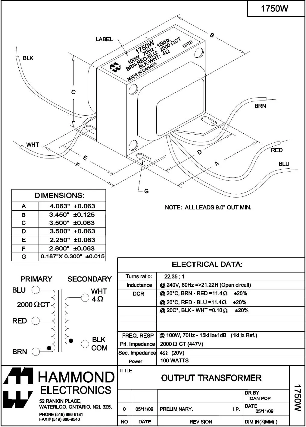 Startseite » Bauteile » Transformatoren » Ausgangsübertrager » Fender » Hammond 1750W für Fender Übertrager 125A29A / 022889 Twin Reverb