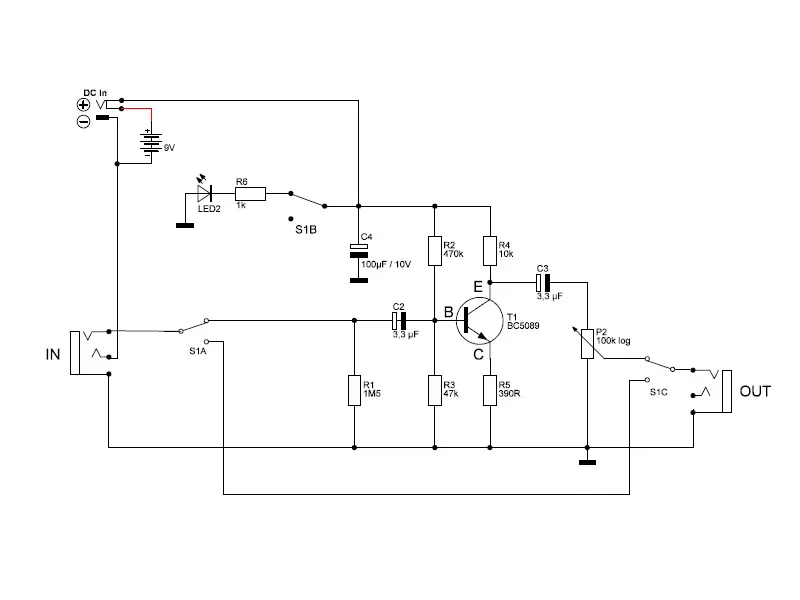 Aufbau auf Universal-STOMP-Board, auch für Einsteiger sehr gut geeignet. Der Bausatz beinhaltet alle grundlegenden Bauteile wie Widerstände, Kondensatoren, Potentiometer, Kabel und Litzen, Anschlussclip, Klinkenbuchsen und Trägerplatine.