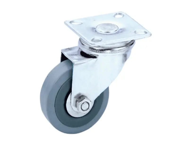50 mm Lenkrolle. Rahmen und Grundplatte Stahl verzinkt. Graue Gummirolle auf geschraubter Achse. Ohne Bremse.