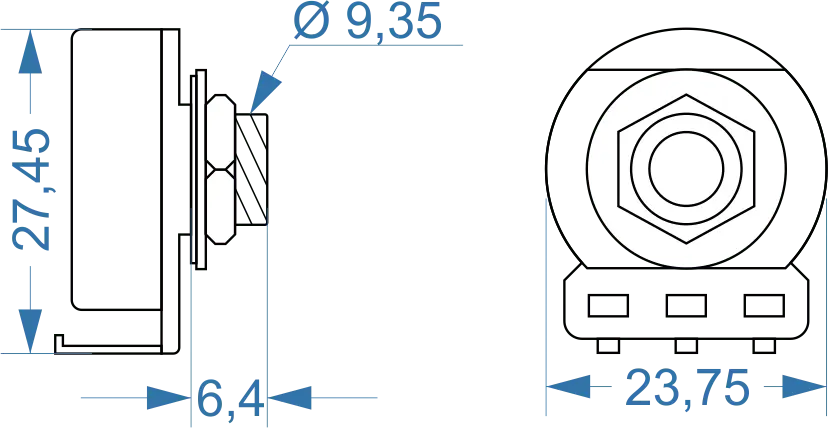CTS potentiometer without nut and washer. Used by Fender for bias adjustment.