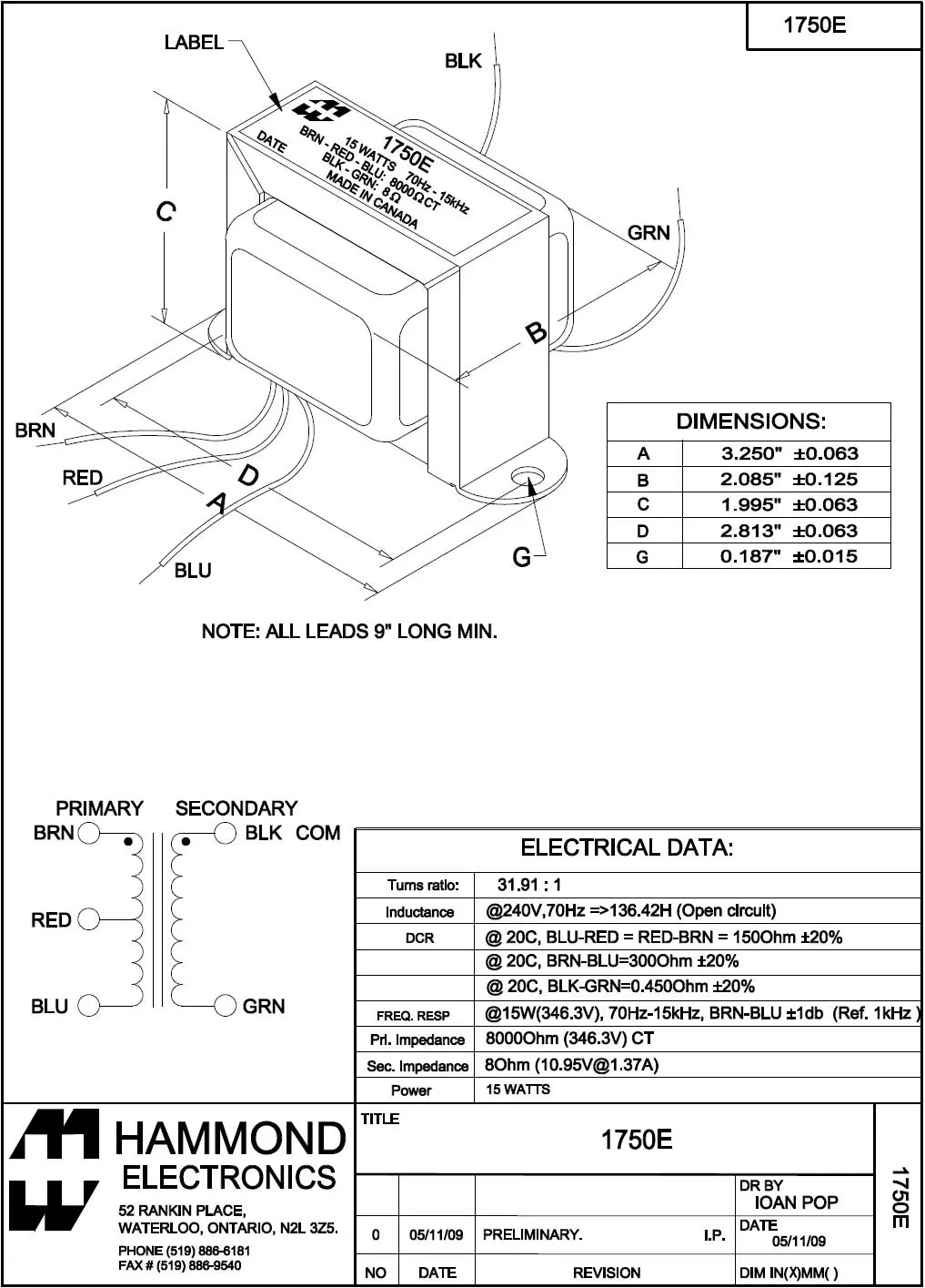 Hammond 1750E for Fender OT 125A10B / 022913 Princeton