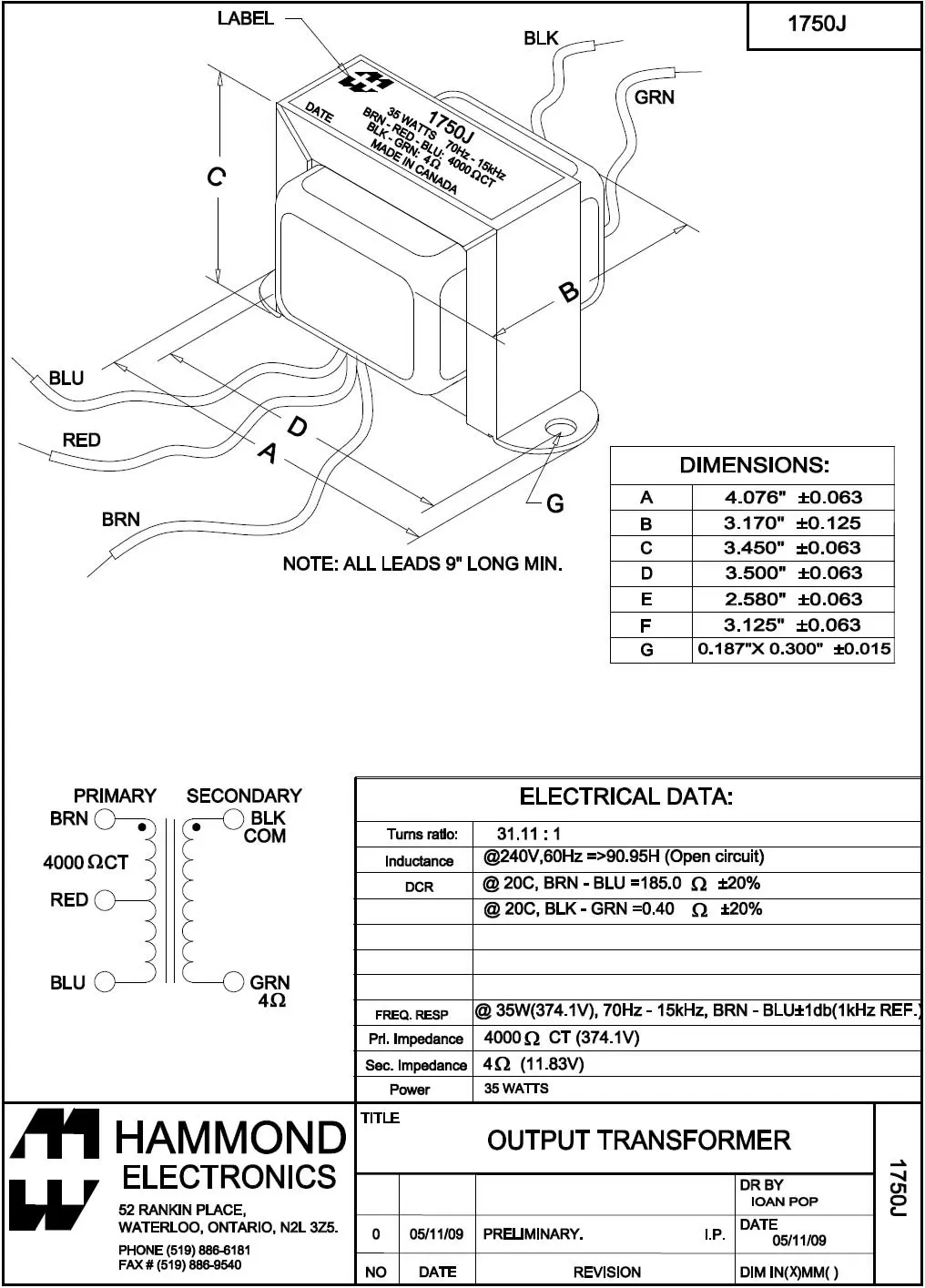 Main page » Components » Transformer » Outputtransformer » Fender » Hammond 1750J for Fender Outputtransformer 125A6A / 022848 Tremolux
