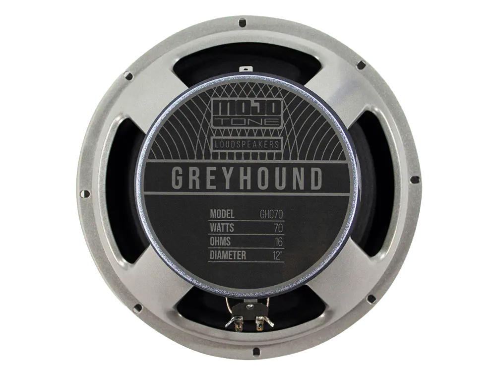 We wanted a new speaker that was in between the British Sound and the American Vintage sound so we came up with the new Greyhound Speaker. During the design process we mainly used a Blackface Twin to test so we think this speaker sounds particularly good in this type of amp as well a Peavey 5150 for high gain. As far as tone goes, the Greyhound is smoother sounding on the top end and upper midrange than a Celestion Vintage 30 but has more punch than a Jensen C12N. It has a great rock tone (specially for mid gain to high gain amplifiers) but stays clean enough for those who don't like too much speaker break-up.