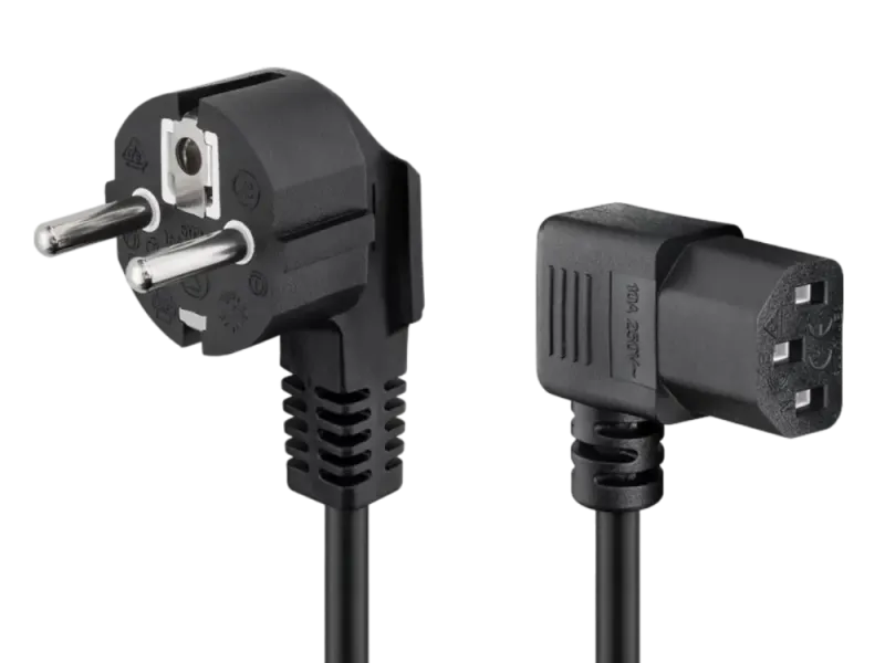 Schuko plug Hybrid (Type E/F, CEE 7/7) 90° > Device socket C13 (cold device connection) 90°.