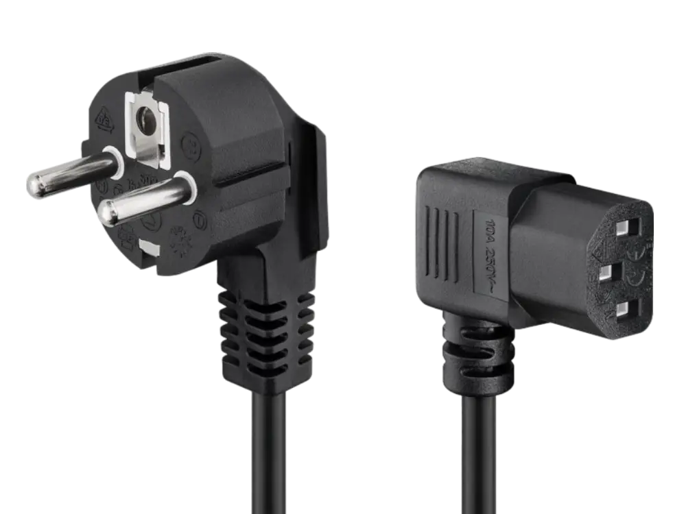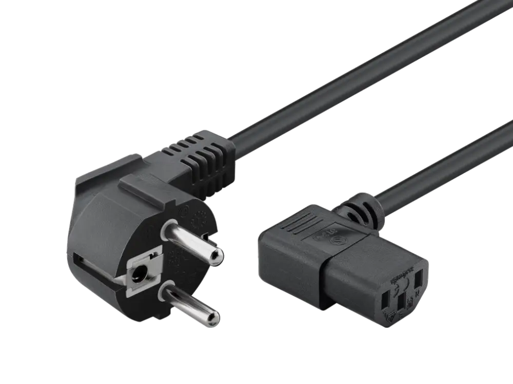 This universally applicable power cable features an angled IEC connector and angled Schuko plug.